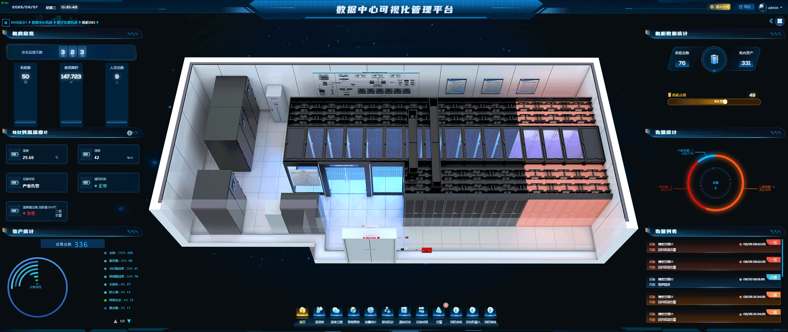 数字环境监管体系:搭建覆盖全区域的环控系统,联动消防与安防系统,实现异常情况的快速定位与自动应急处置,筑牢机房安全防线。引入温湿度自适应调节算法,在分阶段施工期间通过临时制冷方案维持环境稳定,兼顾设备运行安全与能耗控制。
